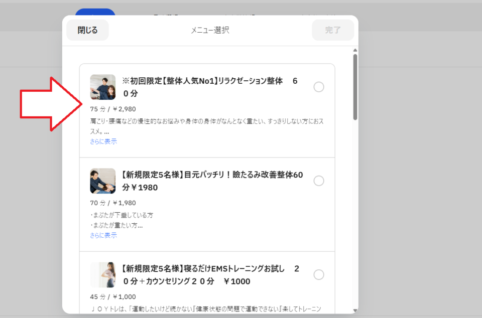 上のボタンからネット予約出来ます。初めての方は初回限定のメニューをお選びください。